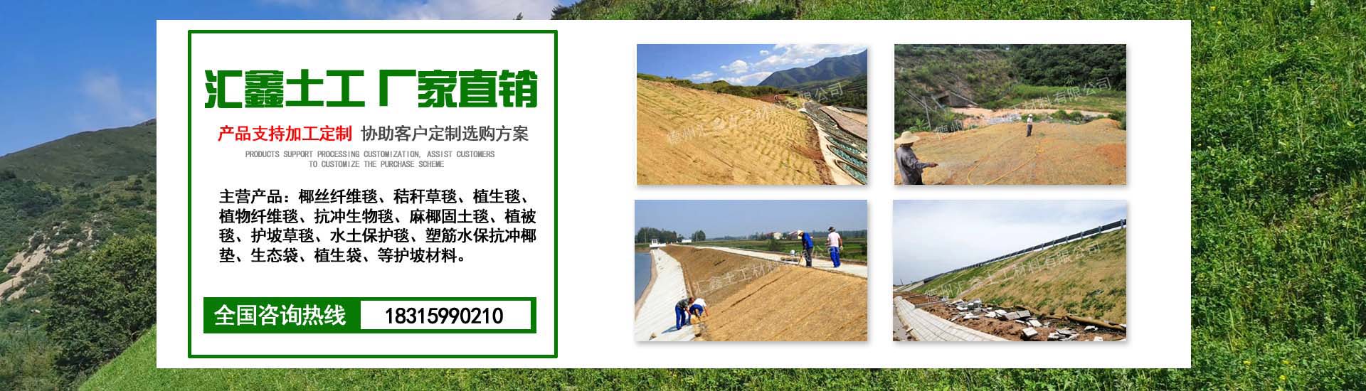 德州匯鑫土工材料有限公司是一家專業(yè)生態(tài)護坡產(chǎn)品、技術(shù)服務(wù)及施工為一體的綜合性企業(yè)。公司主要生產(chǎn)銷售植物纖維毯、植生毯、椰絲毯、抗沖生物毯、生態(tài)毯、秸稈纖維毯、麻椰固土毯、塑筋水保抗沖椰墊、生態(tài)袋、植生袋等各種護坡材料,產(chǎn)品廣泛應(yīng)用于:高速公路邊坡綠化、山體邊坡綠化護坡、河道邊坡、人工湖邊坡防護及其他生態(tài)邊坡治理等工程。經(jīng)廣大工程單位使用證明,產(chǎn)品質(zhì)優(yōu)價廉,施工方便,售后服務(wù)好,得到廣大客戶的一致好評。 "為客戶提供優(yōu)質(zhì)產(chǎn)品及服務(wù)"的宗旨, 熱誠希望攜手各界朋友,共鑄造彼此輝煌。 ...